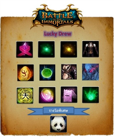 เพียงเติมเงินเกม Battle of the Immortals ราคา 100, 300, 500, 1,000 บาท ผ่านช่องทางใดก็ได้ตั้งแต่วันที่ 26 พฤษภาคม – 09 มิถุนายน 2554 รับ Point เพื่อสุ่มรับไอเทมจากเกม