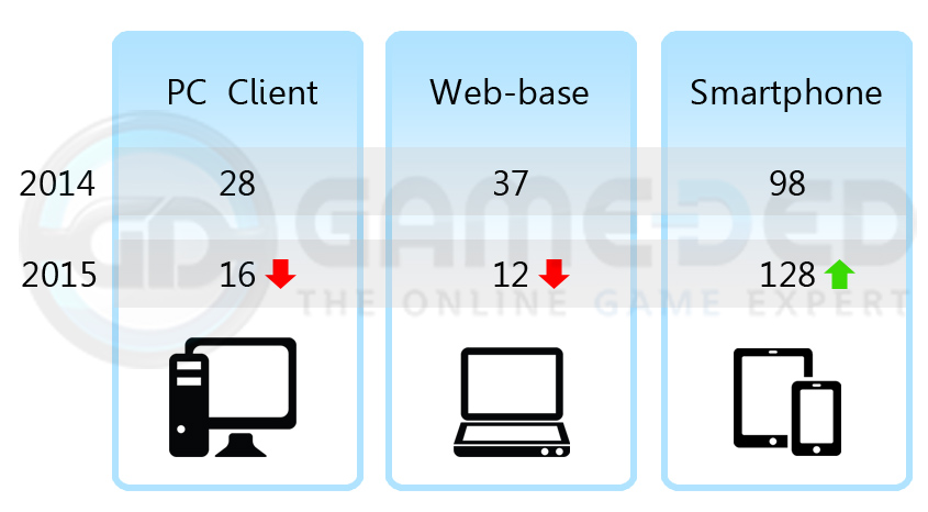 ต่อไปเกมประเภท Web-base หรือที่รู้จักกันว่าเล่นบนเว็บได้เลย ไม่ต้องติดตั้ง “จากปี 2014 มีการเปิดเกมประเภทนี้ถึง 37 เกม แต่ปี 2015 เปิดเพียงแค่ 12 เกมเท่านั้น” เรียกได้ว่าลดลงฮวบถึง 67% เลยล่ะ เนื่องจากการเติบโตของเกมประเภทมือถือมากขึ้น จึงทำให้เกมประเภท Web-base ถูกนิยมน้องลงไปจากเดิม อีกทั้งทางผู้พัฒนาต่างๆ ยังหันไปผลิตเกมมือถือมากขึ้น และเกมเก่าที่มีบน web-base นั้น ก็พอร์ตไปลงมือถือง่ายกว่าด้วย