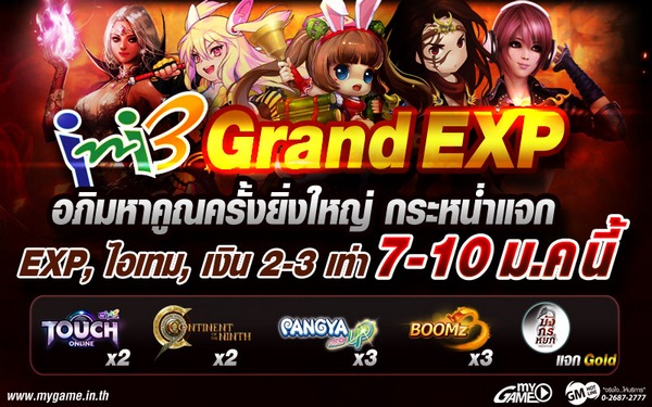 มหกรรมความสนุกกำลังถูกยกมาให้ชาวเกมเมอร์อินิทรีได้สัมผัส ความมันส์จะทวีคูณขึ้นเป็นเท่าตัว เมื่อการฉลองเทศกาลต้อนรับปีใหม่รวมพลังเทศกาลวันเด็กแห่งชาติ ขอแจกโบนัสครั้งยิ่งใหญ่ โดยมี 5 เกมดังพร้อมใจกระหน่ำแจก เปิดช่วงเวลาทองให้กับเพื่อนๆ ทุกท่านที่เข้าเล่นเกม Pangya, C9, BOOMz, TouchOnline และ มังกรหยก Frontier ในช่วงระยะเวลากิจกรรม รับรางวัลแบบจัดหนักเลยทันที!! อภิมหาคูณอย่ารอช้า!! เริ่ม 7 – 10 มกราคม เท่านั้น!! จับตารอเวลา Ini3 Grand EXP กันให้ดีๆ นะจ๊ะทุกคนนน ~^^~ ได้เวลาสนุกแล้วซิ! ได้เวลาสนุกแล้วซิ!