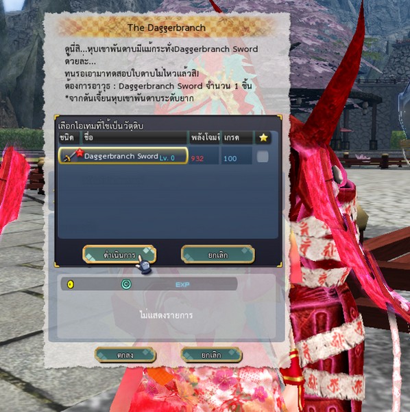 ในเบื้องต้น เควสจะให้เราผ่านดันเจี้ยน หุบเขาพันดาบระดับง่าย ก่อน 1 ครั้ง และจากนั้นต้องลงระดับง่ายเพื่อหาดาบที่ชื่อว่า Gouentou ซึ่งจะดร็อปจากบอสเท่านั้น ขอเพียงอดทนสักหน่อยก็จะผ่านเควสนี้ไปได้