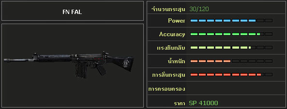 FN FAL ปืนกลอันดับ 1 จากเซิฟเวอร์เกาหลี โดยประสิทธิภาพดีกว่าเหรือเทียบเท่า M4A1 ด้วยจำนวนยอดจำหน่ายเดือนแรก เทียบเท่ากับยอดจำหน่าย M4A1 ปืนกลอันดับ 5 ของโลก ที่จะมาครอบครองบัลลังค์อันดับ 1 ปืนกลยอดเยี่ยมใน Special Force ประเทศไทยประจำปี 2011 หลังจากที่ครองอันดับ 1 ในเซิฟเวอร์เกาหลีมาแล้ว