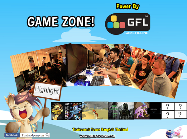 ด้วยความนิยมของการ์ตูน My Little Pony ที่มีแฟนคลับเป็นผู้ชายมากมาย ทำให้กำเนิดสุดยอดเกมแฟนเมด ซึ่งเราได้รวบรวมสุดยอดเกมมาให้ทดลองเล่นกันในงานนี้ พร้อมกับเกมใหม่อย่าง “PonyVRVille” เวอร์ชันใหม่เล่นพร้อมกับ Oculus Rift , Fallout : Equestria , NIA : path of light จากประเทศรัสเซีย และเกมใหม่อีกเกมที่รอคอยให้ร่วมสนุก พร้อมกับสินค้าเกมมิ่งเกียร์สุดพิเศษ นำโดย “GAMEFILLING” นั่นเอง