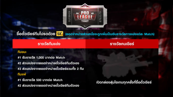 ความพิเศษของรายการนี้คือเราจะมีเงินรางวัลอัดฉีดการแข่งขันให้กับทีมแข่งทุกแมตช์ ไม่ว่าจะแพ้หรือจะชนะ ถือเป็นโมเดลที่ฝึกวินัยนักกีฬาอีกรูปแบบหนึ่ง ลดปัญหาการแพ้บาย และเนื่องจากรายการนี้ต้องแข่งขันกันต่อเนื่องตลอดปี เงินอัดฉีดตรงนี้จะช่วยทำให้นักแข่งมีงบประมาณใช้ซ้อมตลอดการแข่งขัน ส่วนผู้เล่นทั่วไปสามารถมีส่วนร่วมในการเชียร์ทีมที่ชื่นชอบได้โดยการซื้อตั๋วเชียร์ทีมนั้นๆ ซึ่งจะได้ลุ้นไอเทมทุกครั้งที่ซื้อตั๋ว และเงินรายได้จากการจำหน่ายตั๋วเชียร์นี้จะถูกนำไปเป็นเงินรางวัลสมทบกับเงินอัดฉีด และแบ่งให้แก่ทั้ง 2 ทีมในแต่ละแมตช์!”