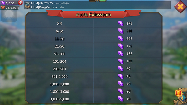 โดยผลตอบแทนสำหรับการมีอันดับดีๆ ใน Collosseum นั้นเราจะได้รับเพชรเป็นรางวัลตอบแทน โดยท่านลอร์ดจะสามารถเข้ามา รับรางวัลได้ทุกๆ 3 ชม. ยิ่งอันดับใน Collosseum สูงเท่าใดผลตอบแทนที่ได้ก็ยิ่งสูงเท่านั้น