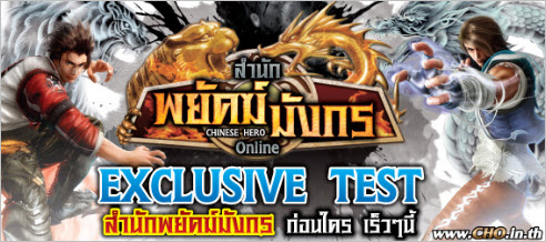 กิจกรรม Chinese Hero EP2 Exclusive Test นี้ จะเป็นการเซิร์ฟเวอร์พิเศษ เพื่อให้เพื่อนๆ ได้เข้าไปสัมผัสกับประสบการณ์ความมันส์ ของ Episode 2 “สำนักพยัคฆ์มังกร” ที่มีการเพิ่มเข้ามา ทั้ง สำนักใหม่ อาชีพใหม่ ไอเทมแบบใหม่ รวมไปถึงฟีเจอร์ใหม่ ในเซิร์ฟเวอร์พิเศษ ก่อนที่ตัวเกมจะทำการอัพเดทจริง