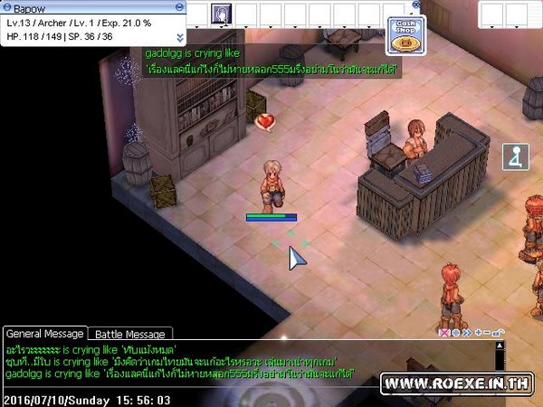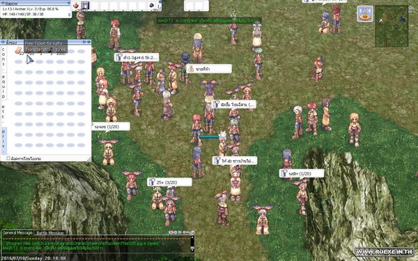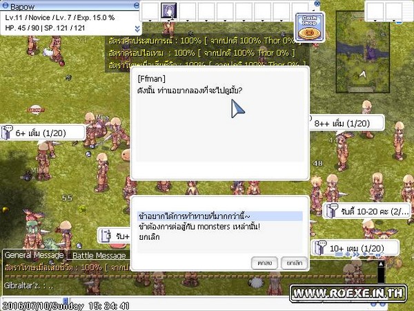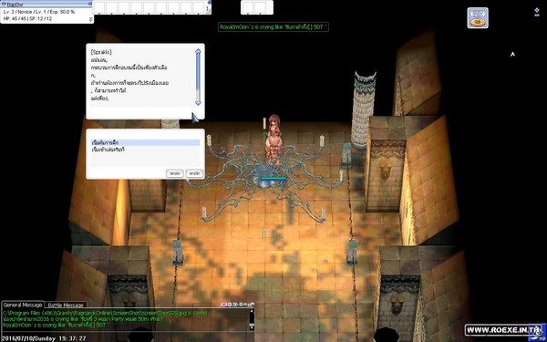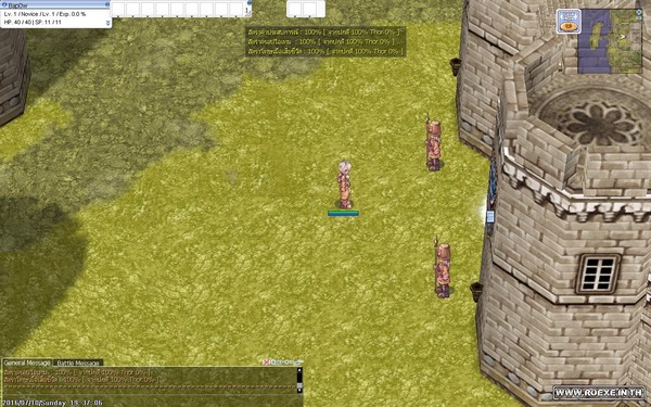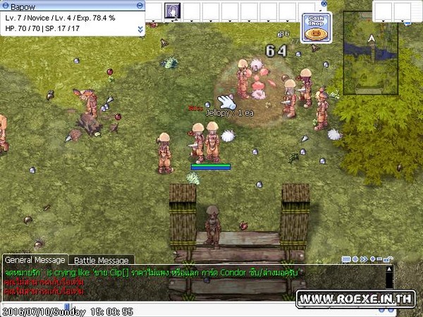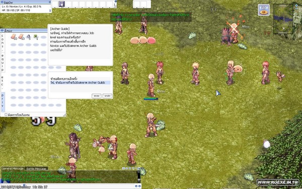 ซึ่งห้องนี้คนจะเยอะมากๆ เพราะเป็นห้องที่มีมอนเตอร์เริ่มต้นที่มีของเควสแต่ละอาชีพ ดรอบเกือบทั้งหมด โดยเมื่อเราเข้ามาแล้วนอกจากจะมี Brad ที่คอยเพิ่มเลือดให้เราฟรีแล้วยังจะได้ RED potion มาอีก100 ขวด และยังมีคนอื่นๆ ที่เล่นตั้งรับตี้ที่นี่อีกด้วย ทำให้เวลได้เร็วขึ้น แต่หากกลัวคนอื่นจะนั่งดูดและคนเยอะเกินไปให้เอาเมาส์ลากหา NPC Trainer ให้เจอ เราจะสามารถเลือกขอไปชั้น 2 ได้ ซึ่งคนจะน้อยกว่าเล็กน้อย เพราะบางคนยังไม่รู้และหาที่กดไม่เจอเพราะคนเยอะมาก ทีนี้พอเราขึ้นมาชั้นบนเราจะมีโอกาสมองเห็น NPC อื่นๆ ซึ่งเป็น NPC ประจำอาชีพทั้งหมดในเกม เมื่อเราคุยแล้วเราจะได้ใช้สกิลเบื้องต้น (เป็นไอเทมกดใช้อยู่ในของสวมใส่) แนะนำให้ขอสกิลของอาชีพ โจร Thief เพราะจะได้การโจมตีแบบดับเบิ้ลมาซึ่งเป็นจุดเด่นของอาชีพโจรทำให้เราฆ่ามอนได้เร็วขึ้น (แต่ไม่ได้ตีติดทุกครั้งหรอกนะ) ทีนี้ก็เก็บเลเวลง่ายๆ แล้วครับ แต่ก่อนจะขอสกิลมาใช้งานได้จะต้องผ่านเควสที่ 2 ของ Brad โดยการเก็บ Jellopy มาก่อน 1 ชิ้นแล้วคุยกับ Brad อีกครั้ง