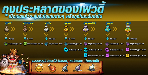 ในช่วงกิจกรรม โม่เวทย์ของราชาผู้ร่ำรวย “โฟรดี้” จะมอบถุงโฟรดี้ให้กับผู้เล่น โดยจะทำการสุ่มถุงระดับต่างๆ ให้แก่ผู้เล่น ซึ่งก็ต้องขอบอกไว้ก่อนเลยว่าของที่ได้รับจากถุงโฟรดี้ระดับสูงนั้นมีมูลค่ามากมายเลยทีเดียว อาทิเช่น เพชร, วัตถุดิบวีรบุรุษ 4 ดาวและหินเรียกวีรบุรุษ 5 – 6 ดาวเป็นต้น สำหรับถุงโฟวดี้นั้นนอกจากจะได้รับจากโม่เวทย์แล้ว ยังได้รับเป็นของรางวัลเมื่อผ่านแผนที่โลก หรือกำจัดแชปเอตร์บอสำเร็จอีกด้วยนะ