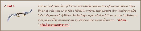 ความสามารถในการโจมตีและป้องกันไม่ค่อยเด่น แต่เชี่ยวชาญในการใช้กริชควบคุมฝ่ายตรงข้ามสามารถควบคุมฝ่ายตรงข้ามให้อยู่ในมือเราได้ และสาศัยการการโจมตีด้วยไหวพริบ