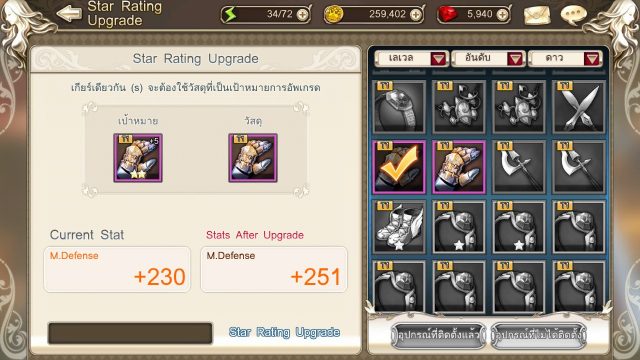 ไปที่โรงตีเหล็กของเมือง Capital Orvel เลือกคำสั่ง Star Rating Upgrade โดยในการอัพเกรดดาวนี้จะเพิ่มพลังให้กับอุปกรณ์อย่างมาก แต่ต้องใช้อุปกรณ์ชนิดเดียวกันมาอัพเกรดและมีโอกาสล้มเหลวด้วย (ถ้าล้มเหลว อุปกรณ์ตีจะไม่หาย แต่อุปกรณ์ที่เป็นวัตถุดิบจะหาย) โดยมีโอกาสได้แก่