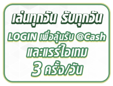 เล่นทุกวัน รับทุกวัน: ล็อคอินในช่วงเวลา 16.00 – 22.00 น. และเล่นเกมอย่างน้อย 10 นาที จากนั้นเข้าระบบกิจกรรมรับ 3 สิทธิ์/วัน เพื่อสุ่มรับ @Cash หรือแรร์ไอเทม