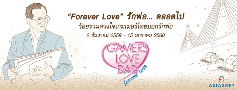 “Gamers Love Dad: Forever Love” ที่ได้จัดต่อเนื่องมาจนถึงปีที่ 11 แล้วโดย ผ่าน 2 กิจกรรมดีๆ คือ “คำสอนของพ่อ” และ “ภาพของพ่อ” ซึ่งกิจกรรมนี้จะเปิดโอกาสให้เหล่าเกมเมอร์ได้บอกเล่าประสบการณ์ในการทำความดีตามรอยพ่อ พร้อมทั้งเปิดโอกาสในการสร้างสรรค์ผลงานรูปวาด เพื่อถ่ายทอดภาพความทรงจำของพ่อของปวงชนชาวไทยทุกคน โดยทั้ง 2 กิจกรรม เริ่มตั้งแต่วันนี้ – 15 มกราคม 2560 รายละเอียดเพิ่มเติม http://www.asiasoft.co.th/lovedad-foreverlove