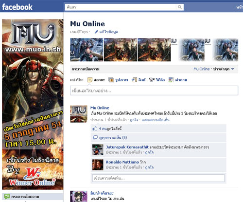 สำหรับสาวก MU Online ตอนนี้รีบกด Like แรงๆ ให้กับ Facebook Mu เพื่อง่ายต่อการติดตามข่าวสารอย่างฉับไว และเป็นช่องทางที่คุณจะได้พบกับเพื่อนเก่าๆ สมัยหนุ่มๆ อีกด้วย