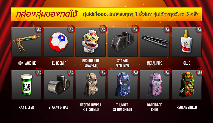 กล่องสุ่มของกดใช้ สุ่มได้เมื่อออนไลน์ครบทุกๆ 1 ชั่วโมง สุ่มได้สูงสุดวันละ 5 ครั้ง