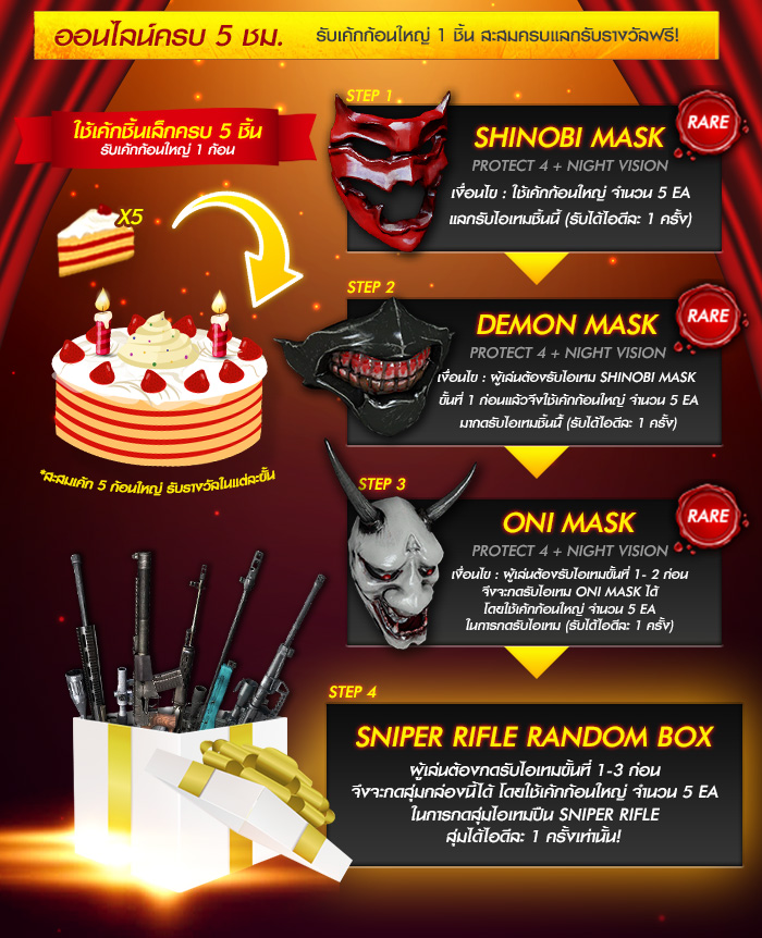 – 1 ไอดี สามารถรับไอเทมแรร์ได้ 1 ครั้งเท่านั้น โดยจะแบ่งไอเทมแรร์ออกเป็น 4 ระดับ ซึ่งผู้เล่นต้องเริ่มรับ Step 1 ก่อน และสะสมจำนวนเค้กไปเรื่อยๆ จนสามารถรับ Step 4 ได้