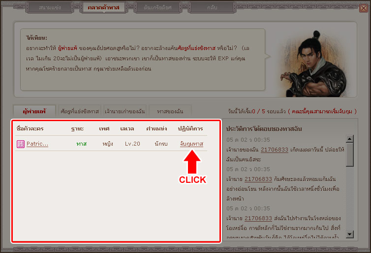 การรับทาสหรือจับทาสนั้นทำได้โดยเริ่มต้นให้เพื่อนๆ เลือกคลิ๊กที่ “สนามแข่ง” เพื่อนเข้าไปยังสนามประลองซึ่งจะพบกับรายชื่อของผู้เล่นอื่นๆ อีกมากมายที่รอให้เราไปพิสูจน์ฝีมือ