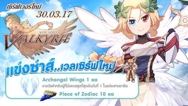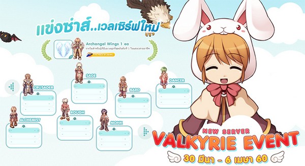 เราขอท้าดวลเหล่าผู้กล้าทุกท่านก้าวเข้าสู่การผจญภัยในดินแดนแห่งใหม่นามว่า Valkyrie พร้อมการแข่งขันเพื่อเป็นที่สุดในแต่ละสายอาชีพ ผู้ที่สามารถทำเลเวลได้สูงสุดเตรียมรับของรางวัลสุดพิเศษไปเลยทันที! กิจกรรมนี้สำหรับตัวละครในเซิร์ฟเวอร์ Valkyrie เท่านั้นนะ!