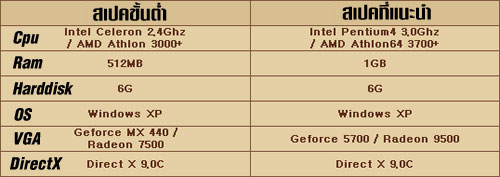 สเปคเครื่องแบบแนะนำ Ram 1 Gb และการ์ดจอ Geforce 5700 เทียบเท่าหรือสูงกว่า สามารถเล่นได้แบบสบายๆ ไร้กังวลเรื่องปัญหากระตุกในที่ที่มีผู้เล่นหนาแน่น