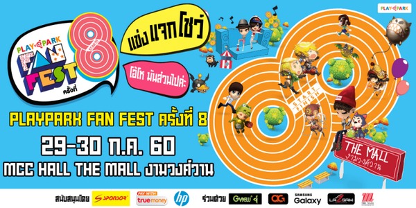 ถึงเวลาความสนุกสุดมันส์ของเหล่าเกมเมอร์ PLAYPARK.COM ผู้ให้บริการเกมออนไลน์ชั้นนำ ในเครือเอเชียซอฟท์ฯ เตรียมพร้อมจัดงานใหญ่ “PLAYPARK Fan Fest ครั้งที่ 8” มหกรรมความสนุกสำหรับชาวเกมเมอร์ PLAYPARK ซึ่งในปีนี้จะจัดขึ้นวันที่ 29 – 30 กรกฎาคม 2560 ที่ MCC Hall เดอะมอลล์ งามวงศ์วาน ใช่แล้วอ่านไม่ผิด ปีนี้จัดขึ้นที่ เดอะ มอลล์ งามวงศ์วาน ถึงจะเปลี่ยนสถานที่ แต่รับรองว่ามันส์เหมือนเดิมแน่นอน โดยปีนี้ได้ผู้ใหญ่ใจดีอย่าง เครื่องดื่มเกลือแร่สปอนเซอร์, TRUE MONEY, HP เป็นผู้สนับสนุนหลัก รวมถึงมีพันธมิตรอีกมากมายที่คอยสนับสนุนความมันส์ของงานในปีนี้!!