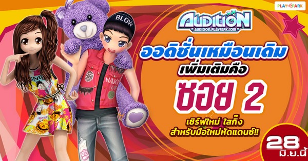 AUDITION เกมแดนซ์ออนไลน์สุดฮิตอันดับ 1 ของเมืองไทย จาก PLAYPARK.COM ก้าวสู่ปีที่ 11 ด้วยความมันส์จัดเต็ม การันตีความฮอตฮิตที่ครองใจขาแดนซ์ชาวไทยตลอดกาล เตรียมเปิดเซิร์ฟเวอร์ใหม่ ให้เข้าเกมได้สะดวกสบาย เล่นง่ายกว่าเดิม ในชื่อ “Audition ซอย 2” เพื่อต้อนรับเหล่าขาแดนซ์หน้าใหม่ที่เพิ่งหัดเต้น ให้ได้มีเพื่อนเต้นที่สามารถสนุกกับการฝึกฝีมือและเก่งไปด้วยกัน ใครที่เจอปัญหาเต้นไม่ทันเพื่อน หาห้องเต้นไม่ได้ กดเพลงเร็วๆ ไม่ไหว สอบขึ้นเลเวลทีแสนยาก มานี่เลย “Audition ซอย 2 เต้นฟรี เวลไว ของใหม่เพียบ พร้อมกัน วันพุธที่ 28 มิถุนายนนี้!!”