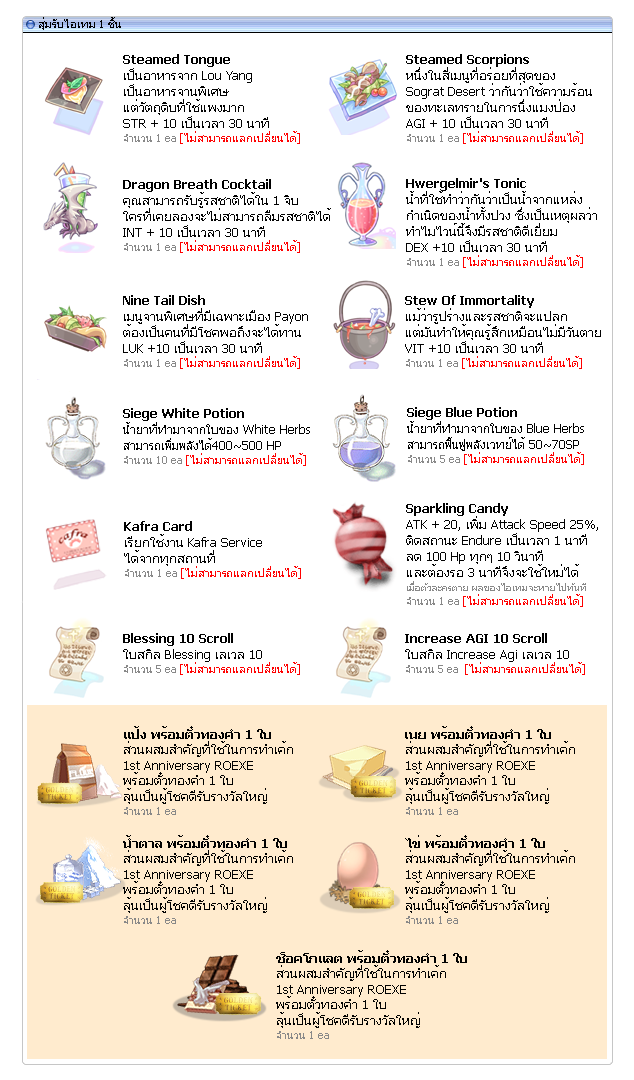 ต้อนรับงานเฉลิมฉลองสุดยิ่งใหญ่ RO Anniversary ครบรอบ 1 ปี กับ Ragnarok Online Thailand ภายใต้บ้านใหม่ Electronics Extreme ขอตอบแทนผู้เล่นจากใจ รับไอเทมเก็บเวลได้ฟรีทุกวัน เพียงแค่หมุนวงล้อ Lucky Roulette พร้อมร่วมกันตามหาส่วนผสมเค้กแสนหวาน ปลดล็อคเค้กได้ถึงที่กำหนดรับไอเทมยกเซิร์ฟไปเลย! ยังไม่พอ!! ร่วมลุ้นเป็นผู้โชคดี ที่ได้เข้าร่วมงานกิจกรรมชิงรางวัลสุดยิ่งใหญ่ การ์ดบาโฟทองคำแท้ หนัก 20 บาท! พร้อมฟิกเกอร์ Baphomet ที่มีเพียงชิ้นเดียวในโลก! และของรางวัลอื่นๆอีกมากมาย ร่วม 200 รางวัล มูลค่าสูงถึง 1,000,000 บาท!!