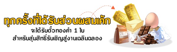 • หากสามารถสุ่มเจอชิ้นส่วนเค้ก จะได้รับตั๋วทองคำ 1 ใบ สะสมเพื่อลุ้นรับสิทธิ์เป็นผู้โชคดีรับรางวัลใหญ่เพิ่มเติม (ยิ่งมีสิทธิ์มากยิ่งมีโอกาสได้มาก)
