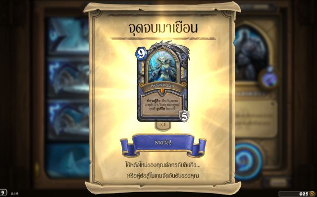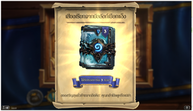 และเมื่อสามารถปราบลิชคิงได้ เราก็จะได้รับสมบัติมากมาย อาทิเช่น ซองการ์ดชุดใหม่ (Knights of Frozen Throne) และการ์ดเดธไนท์ ฟรี! อีก 1 ใบ เช่นกัน ซึ่งจะทยอยเปิดในอาทิตย์ถัดๆไป