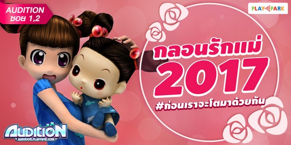 AUDITION เกมแดนซ์ออนไลน์สุดฮิตอันดับ 1 ของเมืองไทย ชวนเพื่อนๆ มาร่วมแต่งกลอนมอบให้แม่ เพื่อแสดงความรักที่มีต่อแม่ พิเศษ!! หากโพสต์กลอนพร้อมรูปที่ถ่ายคู่กับแม่โพสท่าตามภาพตัวอย่างในกิจกรรมนี้รับไอเทมหน้า ระยะเวลา 1 ปี ไปเลย รายละเอียดเพิ่มเติม ร่วมกิจกรรมได้แล้วตั้งแต่วันนี้ – 15สิงหาคม 2560 รายละเอียดเพิ่มเติม (คลิกที่นี่)