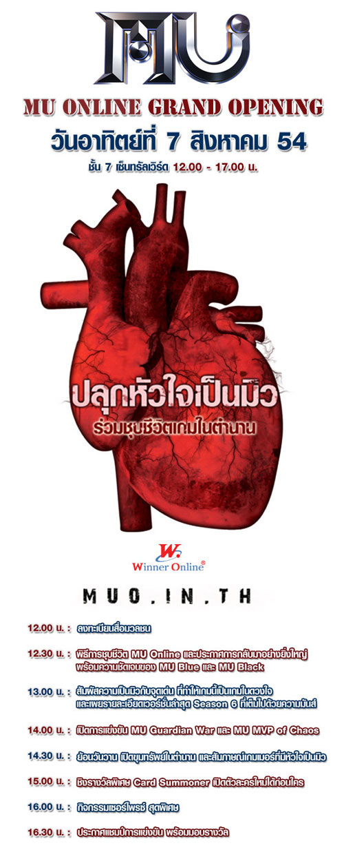 วันอาทิตย์ที่ 7 สิงหาคมนี้ ที่ชั้น 7 Central World งานเปิดตัวที่สาวกมิวไม่ควรพลาด MU Online Grand Opening เพราะงานนี้นอกจากได้ร่วมเป็นเกียรติ์ในการเปิดตัวเกมส์ MU Online อย่างยิ่งใหญ่แล้ว ผู้ร่วมงานจะได้รับไอเทมกลับบ้านอีกด้วย ด้วยเงื่อนไขง่ายๆ เพียงคุณมีเบอร์โทรศัพท์และสมัครเป็นสมาชิก Winner Club ที่คุณสามารถสมัครได้ด้วยตนเองผ่านทางเว็บไซต์ และสามารถสมัครภายในงานเปิดตัวซึ่งจะมีทีมงานแนะนำดูแลอย่างใกล้ชิด และที่สำคัญสมัครฟรี!
