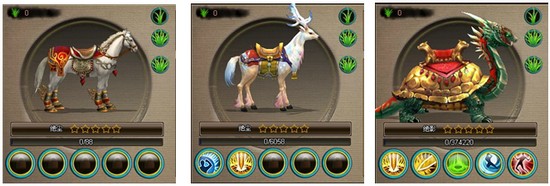 สิ่งที่จะเสริมความแข็งแกร่ง และความสง่างามของขุนพล คงไม่พ้นไปจากสัตว์ขี่คู่ใจ แต่ใช่ว่าจะหามาขี่กันได้อย่างง่ายดายนะ การที่จะได้สัตว์ขี่มานั้น ขุนพลหลักของเราจะต้องมีเลเวลถึง 50 เสียก่อน จึงสามารถเข้าไปเก็บสะสมเหรียญทองเพื่อนำมาซื้อสัตว์ขี่แต่ละตัวได้ แต่สัตว์ขี่แต่ละชนิดก็ยังสามารถวิวัฒนาการเปลี่ยนรูปร่างและความสามารถ เพิ่มขึ้นได้อีก