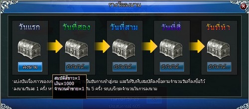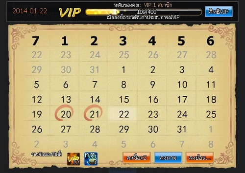 เช็คชื่อในแต่ละวัน จะได้รับไอเทม และค่าประสบการณ์ VIP สามารถกดลงนามได้ฟรีทุกวัน วันละหนึ่งครั้ง แต่หากผู้เล่นเช็คชื่อไม่ทัน ก็สามารถเช็คย้อนหลังได้แต่ต้องจ่ายเหรียญทองในการเช็คชี่อ