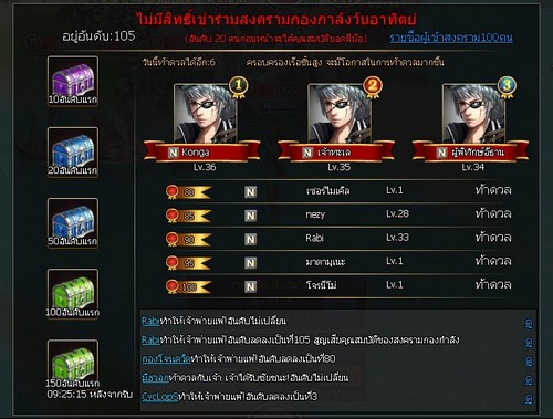 ท้าผู้เล่นเพื่อไต่อันดับให้สูงขึ้น เพราะยิ่งระดับในการ PvP สูงขึ้น ผู้เล่นก็จะได้รับของรางวัลที่ดีขึ้น นอกจากนั้นผู้เล่น 100 อันดับแรกยังได้เข้าร่วมสงครามชิงทะเลหลวงอีกด้วย