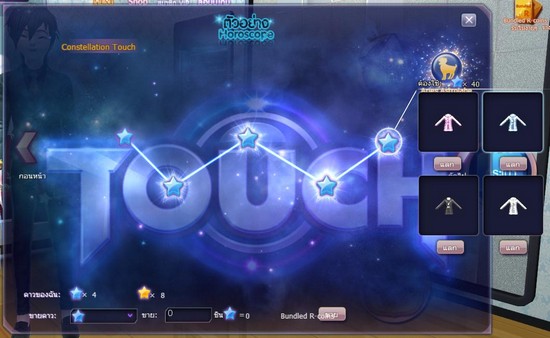 และขอเสริมอีกนิดกับอีกหนึ่งลูกเล่นของ TOUCH online กับระบบดวงดาว ที่เวลาเล่นจะได้รับดาวมาสะสมเพื่อนำไปแลกไอเทมกันฟรี..ฟรี และยังสามารถใช้สุ่มรับแรร์ประจำราศีได้อีกด้วย