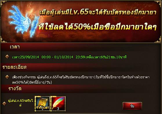 ในช่วงกิจกรรมผู้เล่นที่ถึง Lv.65 สามารถรับบัตรทองปีกมายา 1 ใบ บัตรสามารถแลกในห้างลด 50% ของราคาขายซื้อปีกใดๆ 1 ชิ้น บัตรทองปีกมายามีผล 7 วัน