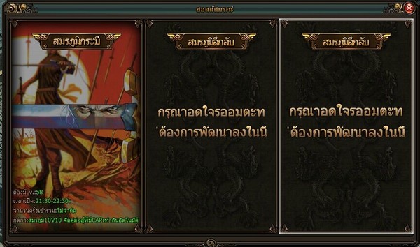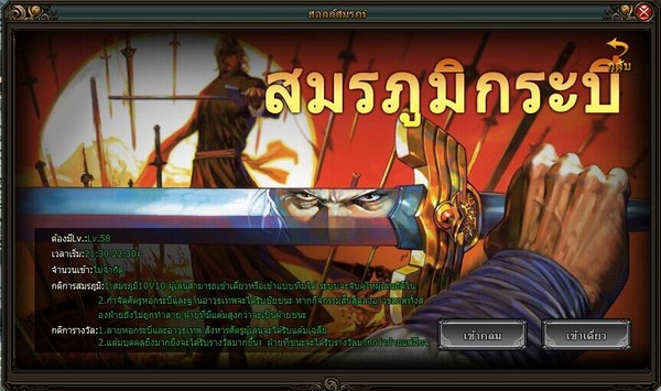 ผู้เล่นสามารถเข้าร่วมกิจกรรมใน เวลา 21:30 น. – 22:30 น. และสามารถเข้าร่วมแบบเดี่ยวหรือเข้าร่วมแบบทีมได้ ระบบจะทำการแบ่งจับคู่จากผู้เล่นที่มี CAP สอดคล้องกันในสมรภูมิกรบี่ 10Vs10 ถ้าทำลายหอกระบี่และทำลายฐานอาวุธเทพของศัตรูจะเป็นฝ่ายชนะ หากเวลากิจกรรมสิ้นสุดลงทั้งสองฝ่ายยังมิอาจทำลายฐานอาวุธเทพได้ ทีมที่มีแต้มสูงกว่าจะเป็นฝ่ายชนะ