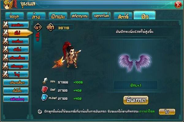ขุนพลที่ปลุกภวังค์แล้วจะเปิดระบบปีก ปีกจึงกลายเป็นสิ่งที่บ่งบอกว่าปลุกภวังค์ขุนพลคนนั้นๆหรือยัง ปีกจะปรากฏบนตัวขุนพลเมื่อเข้าสู่สถานะต่อสู้ ระดับปีกยิ่งสูงก็ยิ่งสวยงาม