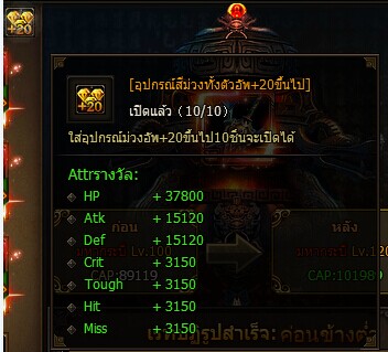 เมื่อตีบวกชุดทั้งตัวถึง + 7 ก็จะได้โบนัส “อัพเกรดคุณสมบัติชุดอุปกรณ์” หากเพื่อน ๆ ยังตีบวกชุดที่มีต่อไปเรื่อย ๆ จนถึง + 10 และ + 15 โบนัส “อัพเกรดคุณสมบัติชุดอุปกรณ์” ก็จะสูงขึ้นอย่างไม่น่าเชื่อ และหากถึง + 20 แล้ว โบนัส “อัพเกรดคุณสมบัติชุดอุปกรณ์” ก็จะสูงมากที่สุดในโลก!