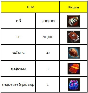 รายละเอียดไอเทม : 3,000,000 เบรี่ + 200,000 SP + 30 พลังงาน + ถุงสุ่มทอง*3 + ถุงสุ่มของขวัญสีม่วงสูง*1