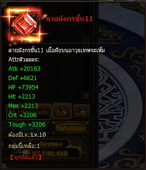 เมื่อเพื่อนๆ เข้าไปในช่องมังกร จะเห็นว่าอาวุธเทพทุกชิ้นมี “ช่องลายมังกร” ทั้งหมด 5 ช่อง แต่เพื่อนๆ ต้องมี CAP อาวุธเทพตามเงื่อนไขจึงจะเปิด “ช่องลายมังกร” ได้ เมื่อเปิดได้แล้ว เพื่อนๆ ก็จะสามารถทำการ “ฝังลายมังกร” และ “ถอด” ในช่องมังกรของอาวุธเทพได้ หลังจากฝังลายมังกรแล้ว เพื่อนๆ ก็จะได้รับโบนัสคุณสมบัติ