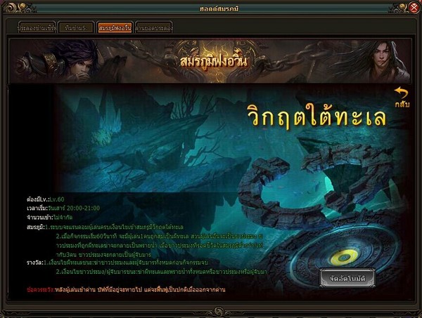 “วิกฤตใต้ทะเล” เป็นการเล่น PVP ในฉากมหาสมุทรกิจกรรมแรกของโลก “The Storm Riders” โดยจะเปิดให้ผู้เล่นได้ร่วมสนุกกันเพียงวันละ 1 ครั้ง และในแต่ละครั้งจะเปิดให้เล่นเพียง 15 นาทีเท่านั้น หลังผู้เล่นสมัครเข้าร่วม ระบบจะส่งผู้เล่นที่มีคุณสมบัติตรงตามเงื่อนไขจำนวน 20 คน วาร์ปไปในด่านเดียวกัน โดยผู้เล่นจะไปปรากฏตัวอยู่ในแผนที่ตามตำแหน่งต่างๆ