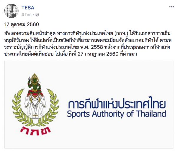 “อัพเดทความคืบหน้าล่าสุด ทางการกีฬาแห่งประเทศไทย (กกท.) ได้รับเอกสารการเซ็นอนุมัติรับรองให้อีสปอร์ตเป็นชนิดกีฬาที่สามารถจดทะเบียนจัดตั้งสมาคมกีฬาได้ ตามพระราชบัญญัติการกีฬาแห่งประเทศไทย พ.ศ. 2558 หลังจากที่ประชุมของการกีฬาแห่งประเทศไทยมีมติเห็นชอบ ไปเมื่อวันที่ 27 กรกฎาคม 2560 ที่ผ่านมา”