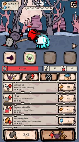 นอกจากการคราฟอุปกรณ์แล้ว จำเป็นจะต้องนำ Gold มาอัพเกรดค่า Status ของตัวละครด้วย มิฉะนั้นจะไม่สามารถผ่านด่านได้ ซึ่งการอัพค่า Status จำเป็นจำต้องอัพให้สมดุลทั้ง พลังโจมตี พลังชีวิต และการฟื้นฟูของ Potion