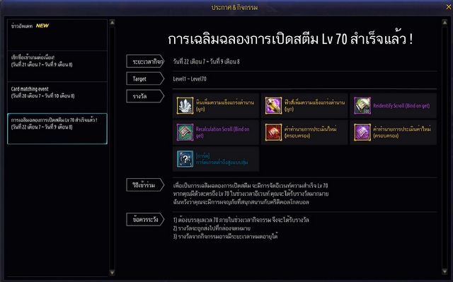 - กิจกรรมพิเศษเช็คอิน และ ไปให้ถึงเลเวล 70 ร่วมสนุกและรับรางวัลกันได้ถึงวันที่ 9 สิงหาคมนี้!