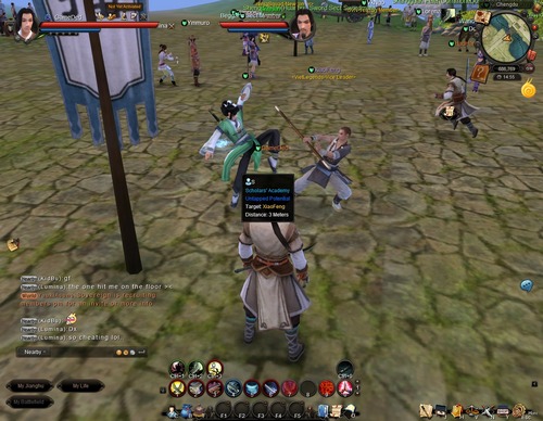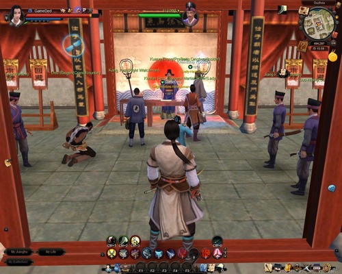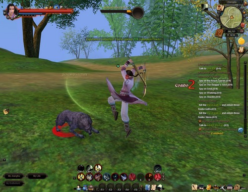 มาว่ากันที่ระบบเควสกันเสียหน่อยดีกว่า ขอบอกว่า Age of Wushu มีเควสต่างๆ ให้เราทำมากมายครับ นอกจากเควสเนื้อเรื่องแล้วยังมีเควสรองให้เราทำกันมากมาย สำหรับเควสเนื้อเรื่องที่เป็นเควสหลักนั้นไม่มีปัญหาครับ เควสพวกนี้จะต่อเนื่องกันไปเรื่อยๆ แต่ปัญหามันอยู่ที่เควสรองทั้งหลายนี่แหละ เนื่องจาก NPC ที่ให้เควสไม่ได้กระจุกตัวและแต่ละเมืองมีขนาดใหญ่มากครับ กว่าจะหาเควสรองครบทุกเมืองเล่นเอาลากเลือดแน่นอนครับ