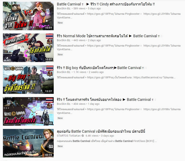 หลังจากที่ช่วงนี้เห็นข่าวคราว ภาพวีดีโอ และ ภาพของเกมออนไลน์ใหม่ Battle Carnival จาก Facebook Fanpage ที่ปล่อยออกมาเรียกน้ำย่อยให้ผู้เล่นได้คอยตามติดตามอัพเดทข่าวสาร และ ทำความรู้จักกับตัวเกม Battle Carnival กันมากขึ้น นอกจากจะมีเหล่าเกมเมอร์คอยถามถึงเวลาเปิดเกม และ รอเล่นอยู่นั้น ก็มีเหล่าแคสเตอร์มากมายที่อดไม่ไหว ขอตบเท้าเข้าไปฝึกฝีมือพรางๆ พร้อมโชว์ความเทพในเซิร์ฟรัสเซียก่อนที่เกมนี้จะเข้าไทย จนเยอะขนาดที่ว่าพอพิมพ์ชื่อเกม “Battle Carnival” เข้าไปใน Youtube ก็จะพบกับวีดีโอรีวิวเกมจากบรรดาแคสเตอร์ชื่อดัง ที่ทำไว้ให้ผู้เล่นได้รับดูรับชมกันอย่างมากมาย