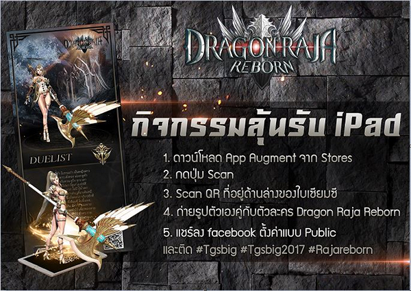 จุดพิเศษของโซนนี้คือผู้ร่วมสนุกจะได้รับ QR Code มาสแกนเพื่อซัมม่อนตัวละครสุดเท่ในเกม Dragon Raja Reborn ให้ออกมาโลดแล่นในรูปแบบ AR และเพียงคุณถ่ายรูปกับตัวละคร Dragon Raja Reborn และแชร์ลง Facebook ก็รับสิทธิ์ชิงรางวัล New iPad มูลค่า 12,900 บาทไปเลยทันที!