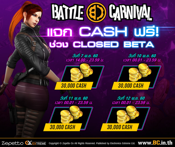 สิ้นสุดการรอคอยกับการเปิด Closed Beta ของเกมออนไลน์ใหม่ Battle Carnival ให้เหล่าสาวกคอเกม FPS ได้เข้าไปสาดกระสุนกันได้อย่างเต็มที่โดยที่รอบนี้ไม่จำกัดจำนวนไอดี เพียงแค่สมัคร EXE ID ก็สามารถเข้าเล่นได้เลย ซึ่งกำหนดการ CBT จะเปิดให้เล่นตั้งแต่ตอนนี้ไปจนถึงวันที่ 14 พ.ย.เวลา 24.00 น.