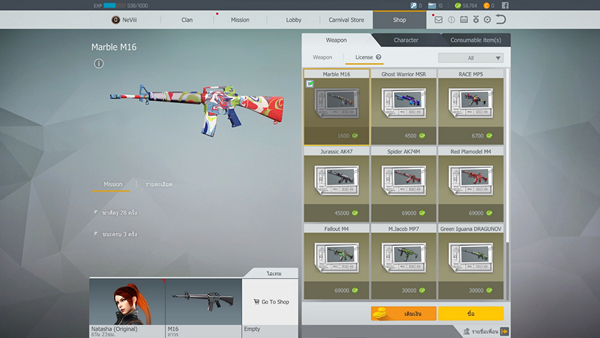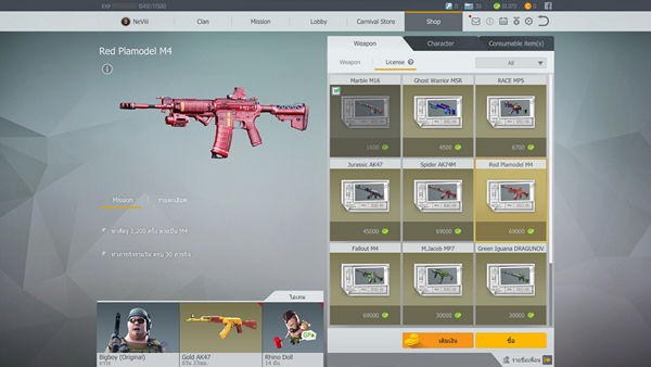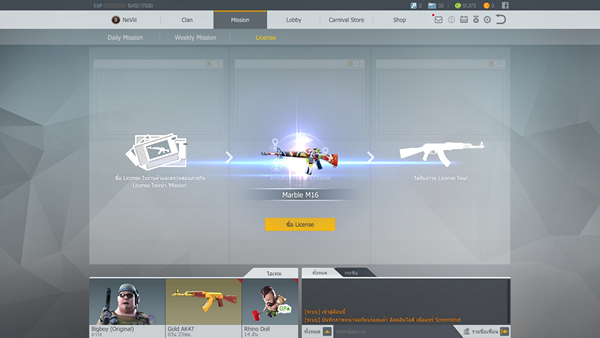 นอกจากนั้นความโดดเด่นของเกมส์จะอยู่ที่ปืนที่มาในหลากหลาย Skin แต่ก็ไม่ต้องเป็นห่วงไปว่าถ้าเราไม่เติมเงินจะอดมีปืนสวยๆ แบบคนอื่น เพราะใน Battle Carnival จะมี ระบบปืน License ที่เราสามารถซื้อด้วยเงินในเกมส์เพื่อเป็นการรับ Mission เมื่อทำภารกิจเสร็จก็จะสามารถรับปืนสวยๆ ไปใช้ฟรีกันเลย