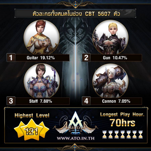 โดยช่วง CBT 4 วันที่ผ่านมา มีสถิติการเลือกอาชีพต่างๆ ในเกมขึ้นมากมาย (เพราะนอกจากเราจะเลือกอาชีพตัวละครได้แล้ว เรายังควบคุมคัดสรรเลือกบรรดาทหารรับจ้างเข้ามาไว้ในทีมได้อีกสูงสุดตั้ง 8 ตัว) โดยอาชีพที่ผู้เล่นเลือกใช้มากที่สุด คือ Guitar คิดเป็นเปอร์เซ็นสูงสุด 19.12% มีผู้เล่นทำเลเวลได้สูงสุดที่เลเวล 121 และมีผู้เล่นเล่นต่อเนื่องยาวนานที่สุด 70 ชั่วโมง (แอบนอนตอนไหน*-*)