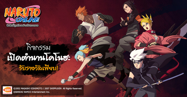 แต่ไม่เพียงแค่นั้นทางทีมงานนินจาของโคโนฮะ ยังได้ร่วมมือกับทาง Tencent และ BANDAI NAMCO Entertainment ทำภารกิจลับ เตรียมการต้อนรับเหล่านินจาหน้าใหม่ที่จะเข้ามาร่วมเกม นารูโตะออนไลน์ ด้วยกิจกรรมต่างๆจำนวนมาก โดยมีของรางวัลมากมายหลากหลายเป็นตัวช่วยให้ท่านนินจาทั้งหลายได้พัฒนาฝีมือให้เก่งกาจมากขึ้น เพื่อเป็นกำลังให้กับหมู่บ้านนินจาต่อไป มีกิจกรรมช่วยเสริมพลังนินจาแบบไหนบ้าง มาลองดูกันเลย