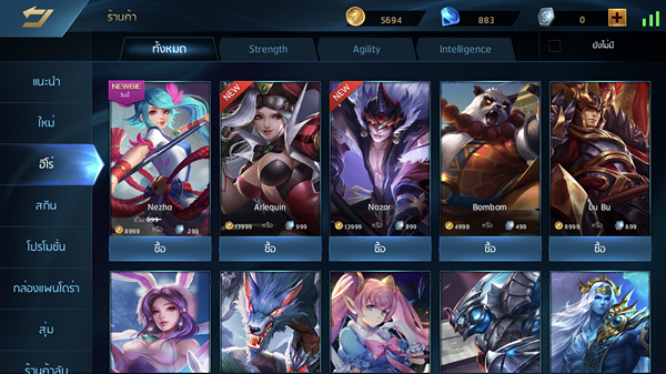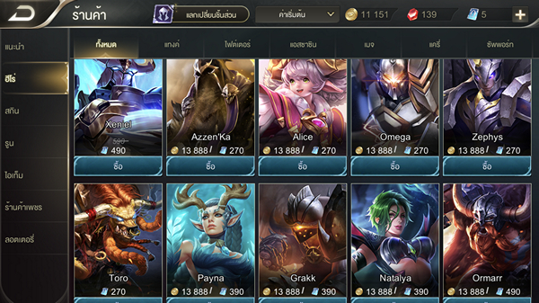 ROV ฮีโร่ส่วนใหญ่ใน ROV จะสามารถใช้ได้ทั้งเงินในเกมส์ และเงินแคชในการซื้อ โดยตัวละครที่ออกใหม่จะยังไม่สามารถใช้เงินในเกมส์ได้เป็นระยะเวลาหนึ่ง แต่ก็มีตัวละครบางตัวที่ต้องใช้เงินแคชเท่านั้นในการซื้อ
